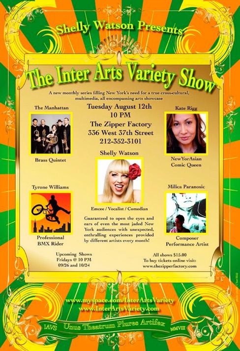 Shelly Watson presents a monthly cross-cultural, multimedia, all encompassing arts showcase. This month's show features the critically acclaimed Manhattan Brass, who literally blow you away; professional BMX rider Tyrone Williams, who will make your pulse jump with every breathtaking trick; Milica Paranosic, who will haunt your senses with an excerpt from her Electronica one woman show; and Oxygen Channel's NewYorAsian comic princess Kate Rigg, laying down some hilarious stand-up. The evening's festivities are all weaved together by Juilliard trained singer and general ringleader Watson, who has appeared everywhere from the stage Metropolitan Opera to the screens of MTV, and hailed as "rambunctious, over the top and of considerable charm" by The New York Times.